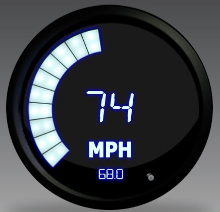 This speedometer is 3 3/8" in Diameter, features an odometer and trip odometer, Super-bright White LEDs with a black bezel and Custom LED bar graph.